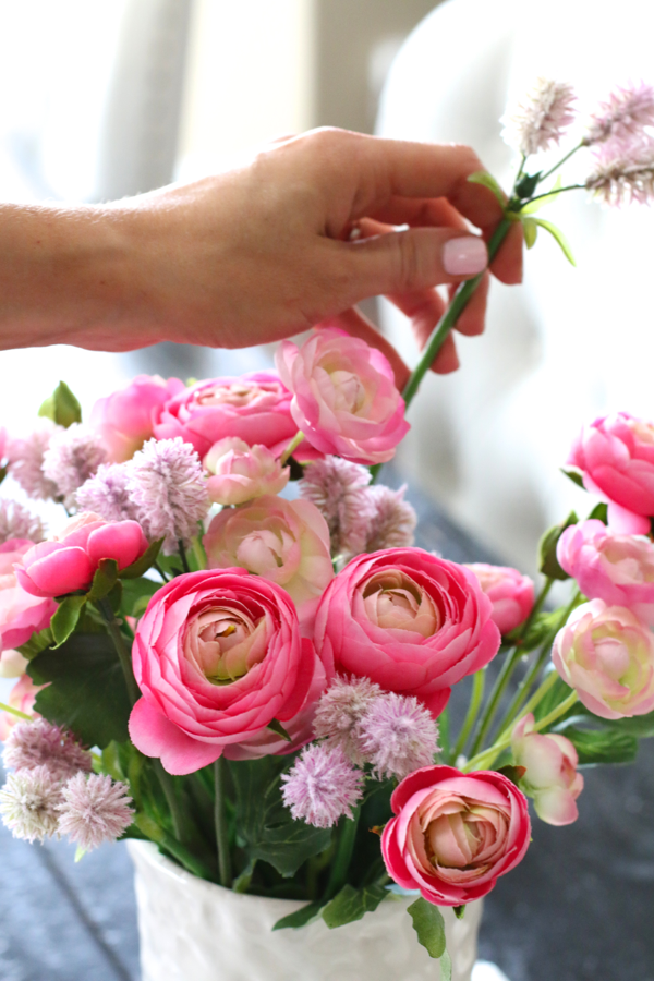 Add a little something extra. When decorating stick to odds. So when picking out flowers use 3 or 5 different kinds of flowers. I chose these darling violet pompoms. Just like step 2 add them all around as filler.